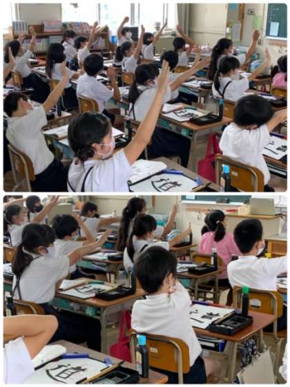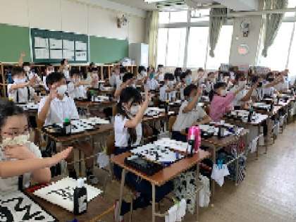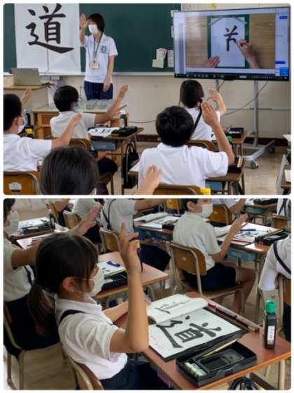 5年生の書道の時間の様子です。「道」という字を練習しています。まずは、電子黒板を活用して、筆遣いを学んでいます。