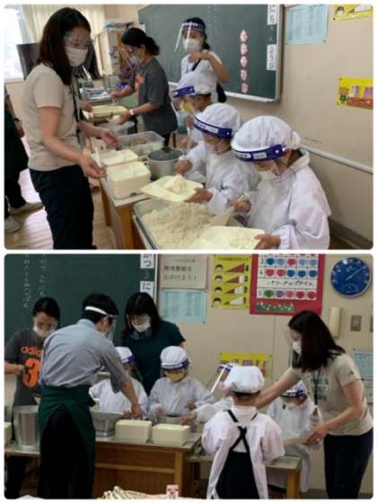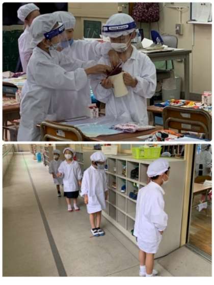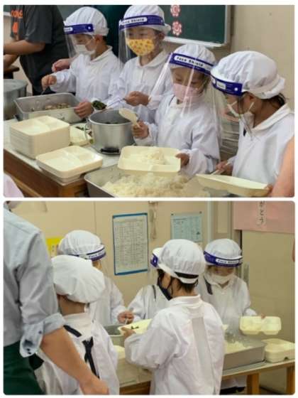 1年生が給食の準備をしています。牛乳やはし等の配布だけでなく、ごはんやおかずの配膳も、自分たちで行いました。汁物だけは先生に配膳してもらっていますが、その他は、全部、自分たちでできるようになりました。