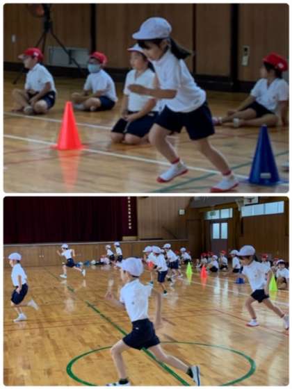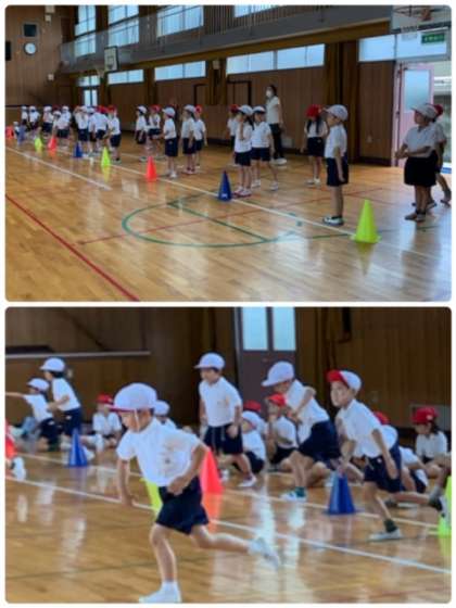 先生の指示を聞いて、体を動かします。まずは、行きは「走って」、帰りは「スキップ」です。