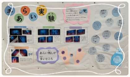 環境健康委員会で「手あらい実験」をしました! 公開日 2020/07/09 更新日 2020/07/09 お知らせ 環境健康委員会で、手あらい実験をしました。特殊なクリームを使って、汚れの落ち方を調べます。光を当てるとクリームのついているところが、青白く光るようになっています。 いいね(0)