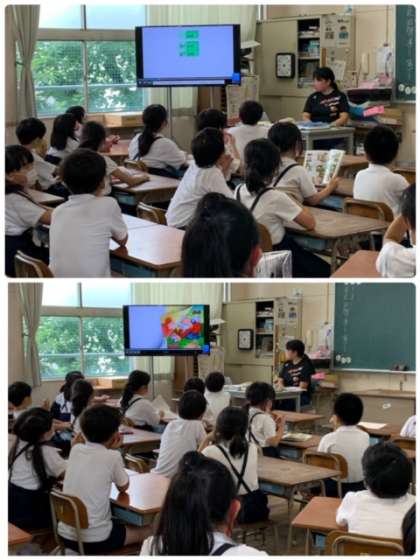 3年生のイングリッシュタイムの様子です。お昼の帯時間を活用して、英語の歌や絵本に親しんでいます。