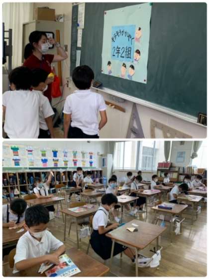 2年2組の学級活動の様子です。クラスの掲示物「キラキラかがやく 2年2組」を作っています。