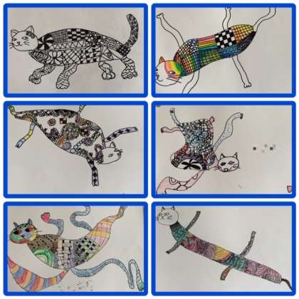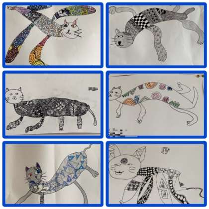 ゼンタングル「動きのあるねこ」です。細かい線で表現しています。
