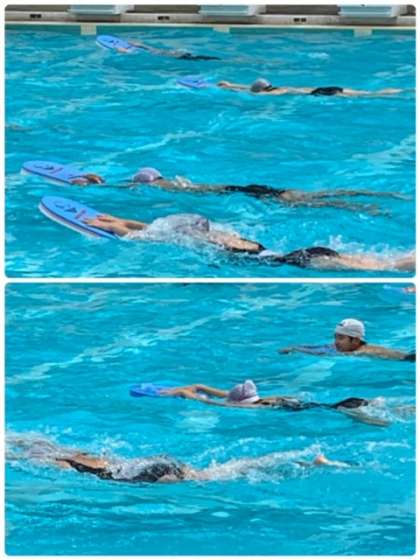 ビート版を使って、「平泳ぎ」の足の動きを確認した後、ビート版を使わないで平泳ぎを練習しました。