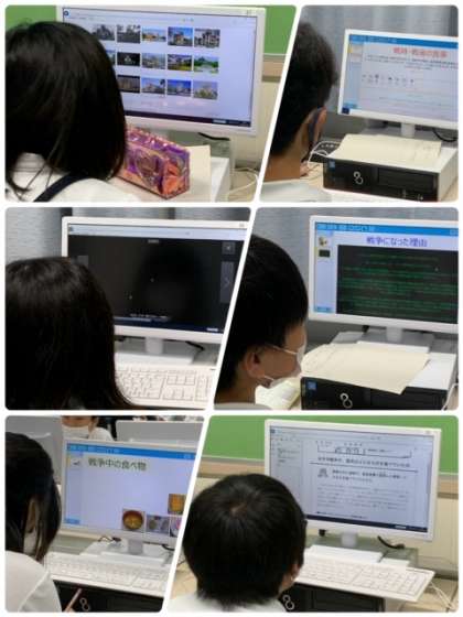 太平洋戦争のこと、広島や長崎に落とされた原爆のこと、戦争中の食べ物等々、各自がテーマを決めて調べています。