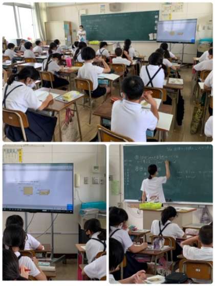 5年生の算数の授業の様子です。今日の学習のめあては、「面積や体積の公式が使えるか調べよう」です。