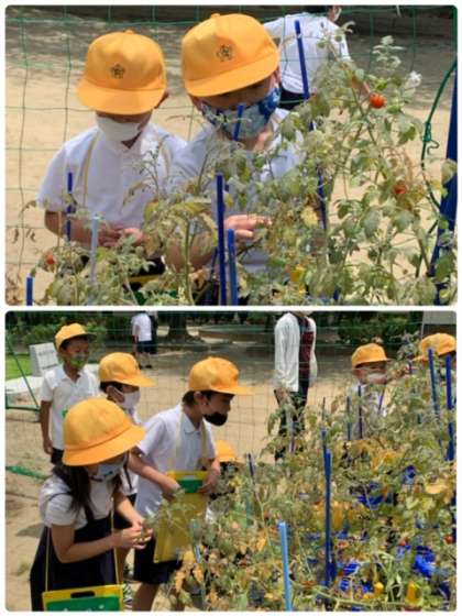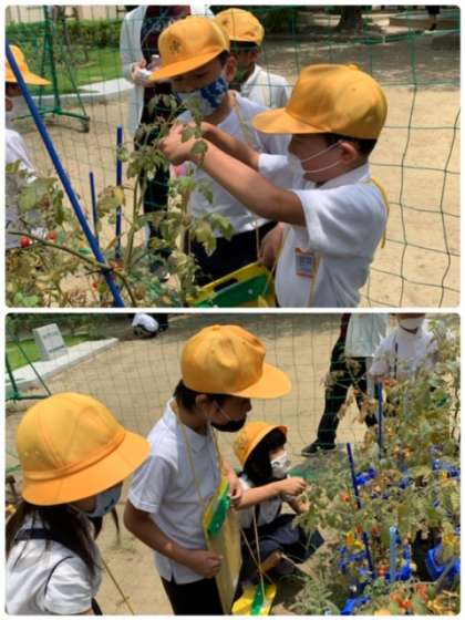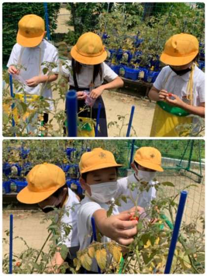 2年生の生活の時間の様子です。「ミニトマト」の水やりと収穫をしています。