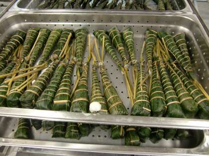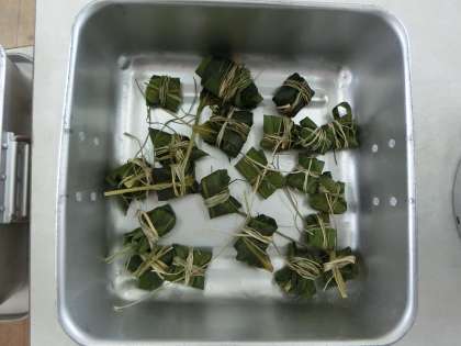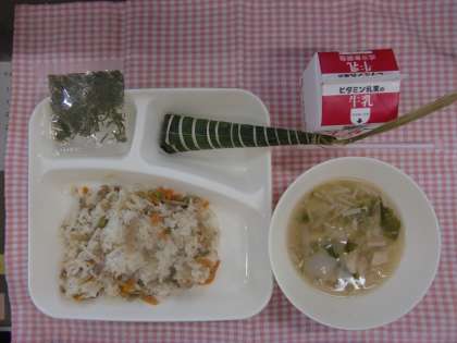 今日の給食は、「きんぴらちらし、すまし汁、ちまき、牛乳」です。子どもの健やかな成長を願う意味で食べられるちまきは、こどもの日の行事献立の予定が、遅れての登場です。給食のちまきは笹の葉で包んでいて、そのまま返すとかなりかさが大きくなります。かさばらないようにして返してほしいと思い、小さくたたんで結んだものをお手本として見せに行くと、「トトロの小包みたい〜!」と子どもたちは大喜び。みんなそれぞれの小包を作ってくれました。写真は「6年生の小包」です。