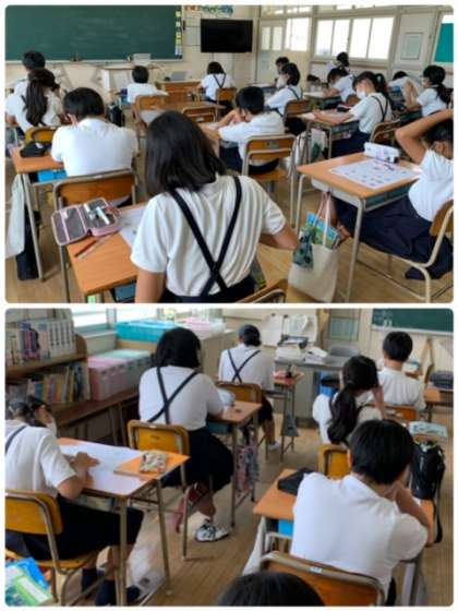6年1組の英語の授業の様子です。今日は、単元テストに挑戦していました。CDを使って音声の聞き取りをしています。聞き取ったことから考えて、テスト用紙に答えを記入しています。6年生、しっかりがんばっていました。