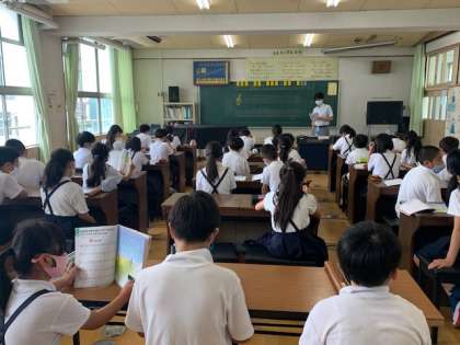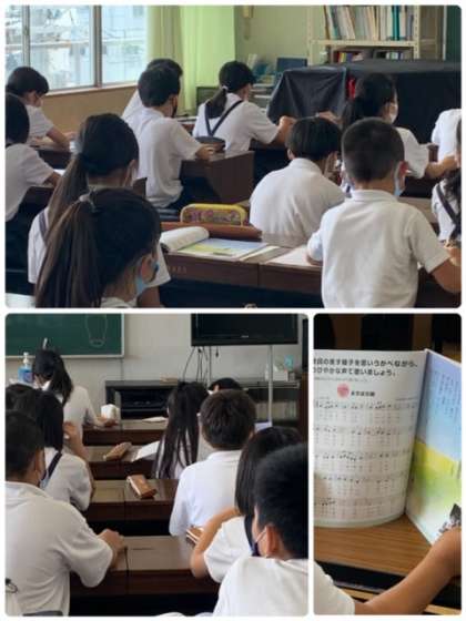 4年生の音楽の時間の様子です。「まきばの朝」を歌っています。最初にCDを聞いてから、みんなで歌いました。「朝」のイメージをのせて歌おうと、先生からの助言がありました。