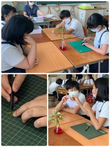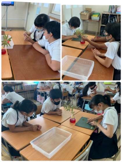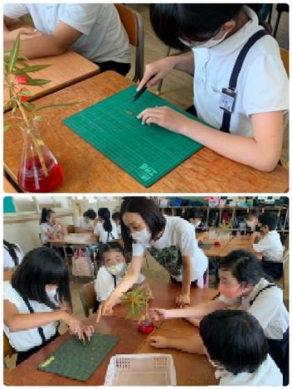 班に分かれて、葉っぱを切って、その切り口を観察しています。
