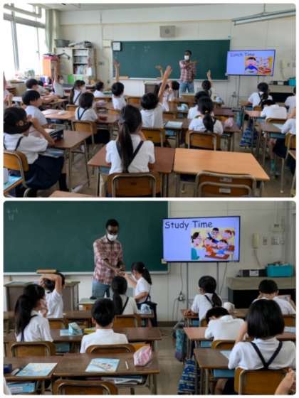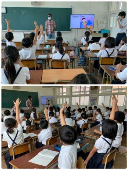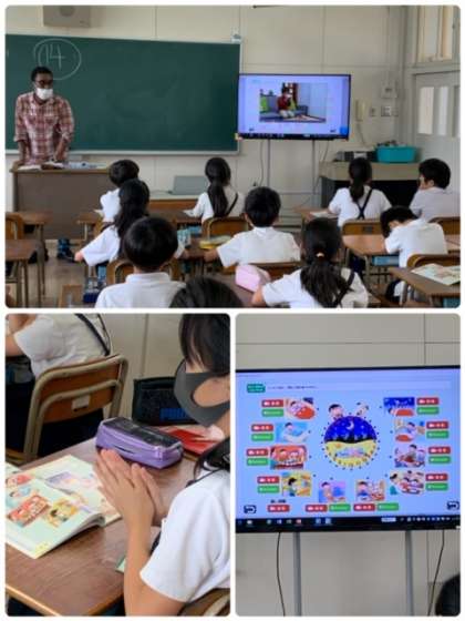 4年生 外国語 公開日 2020/08/05 更新日 2020/08/05 お知らせ 4年生の外国語活動の様子です。今日は、C-NETの先生による授業です。1日の流れを題材に学習していました。例えば「Study Time」と先生の発音を聞いて、何のことか答えていました。たくさんの児童が、積極的に手を挙げていました。 一通りに一日の流れを確認した後は、電子黒板の動画から聞き取ったことから、教科書に書き込んでいました。 いいね(0)