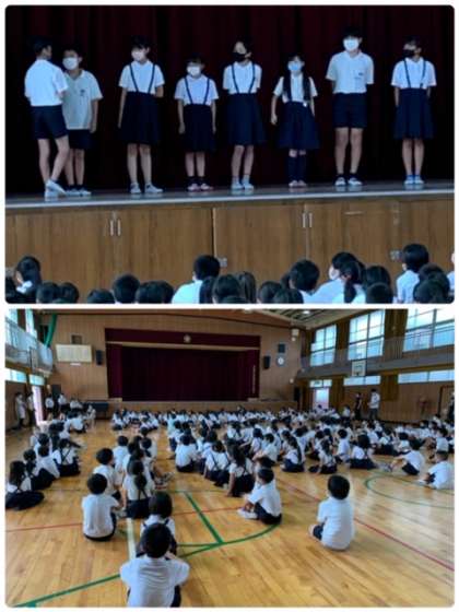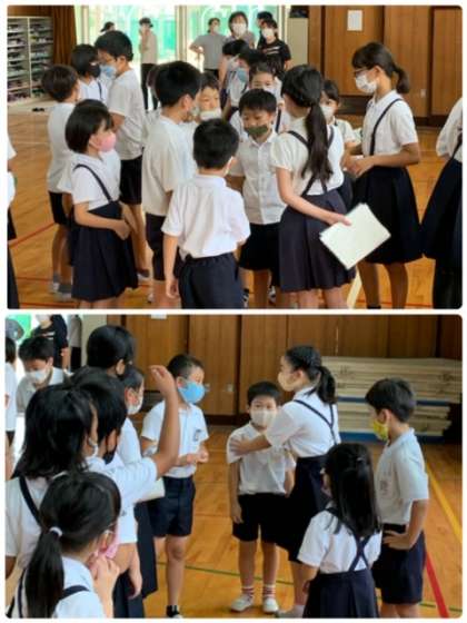 8月7日(金)、1学期の最後の児童集会は、「ならべかえゲーム」でした。進行役の集会委員より、どんな順番にならべかえるのか指示があります。どの班も、高学年の児童が中心となって、ならべかえをしていました。