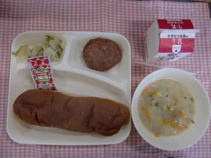 今日の献立は「黒糖パン、焼きハンバーグ、豆乳スープ、キャベツと