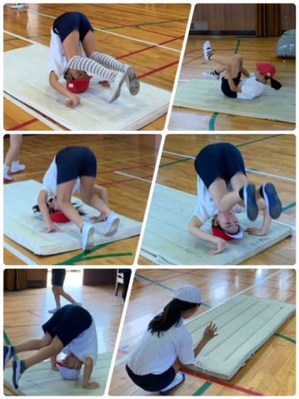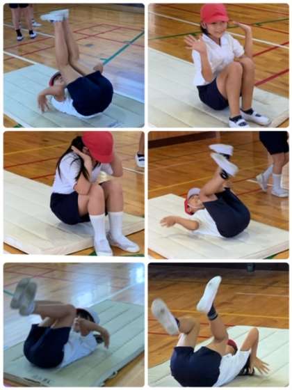 今日は、マット運動をしています。「前転」に続いて「後転」をしています。新しい動きにも取り組んでいます。