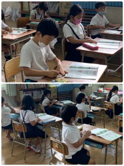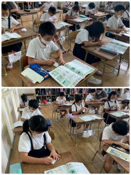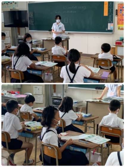 2年1組の図工の授業の様子です。今日の課題は、「うごく おもちゃを つくろう」です。作品「パッチンガエル」を作りました。自分たちでカエルの絵も描いています。