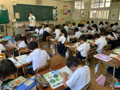 1年生の生活科の授業の様子です。今日は、単元「いきものと なかよし」の学習です。中庭や運動場から生き物を見つけてきました。