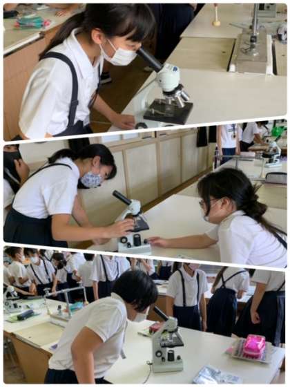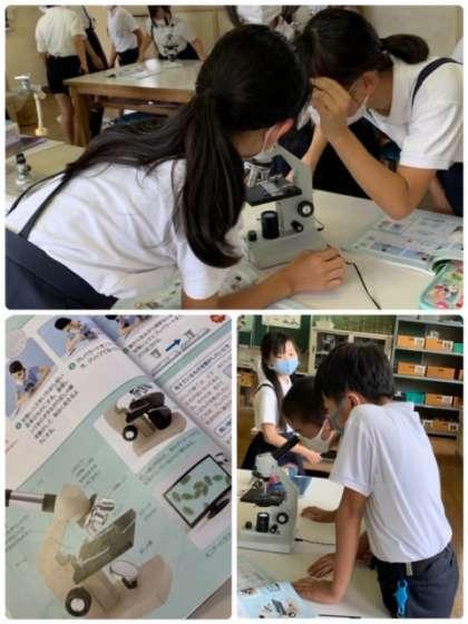 5年生の理科の授業の様子です。理科室で実施しています。今日の学習は、「顕微鏡の使い方を学ぼう」です。花粉を顕微鏡で観察しています。