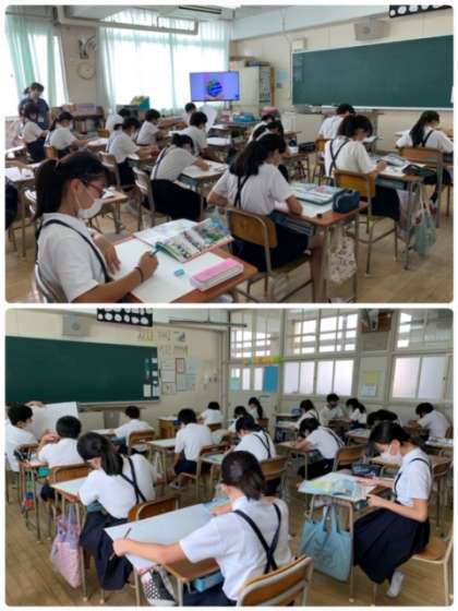 6年2組の図工の授業の様子です。「平和ポスター」を作成しています。