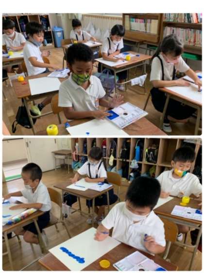 指で画用紙に直接描いています。丸を並べて、ぶどうが出来上がりです!