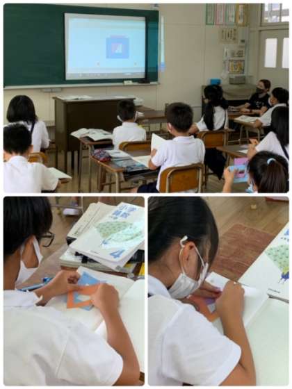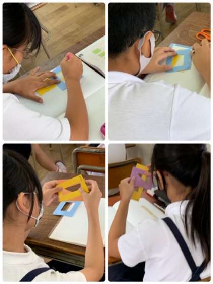 4年生の算数の授業の様子です。「いろいろな四角形」について学習しています。授業の初めには、切り取った「三角形」や「四角形」を利用して、いろいろな形の四角形を作りました。