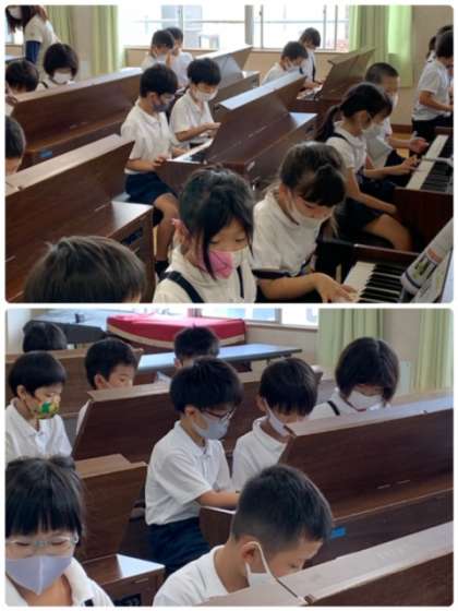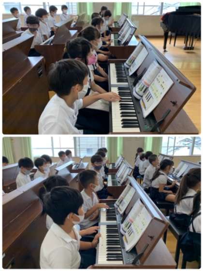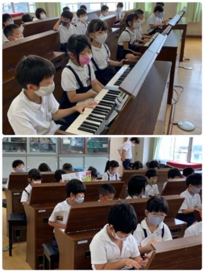 1年生の音楽の授業の様子です。今日の学習は、「ドとソのばしょを みつけましょう」です。教室で学習してきた鍵盤の「ド」の位置や「ソ」の位置を、上手に見つけることができました。