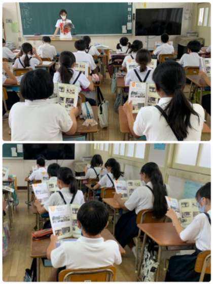 5年生の道徳の授業の様子です。道徳の教科書の「平和に向けて −今できることー」の学習をしています。広島や長崎、沖縄、世界で起こっている紛争に触れて、私たちにできることを考えていっています。