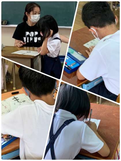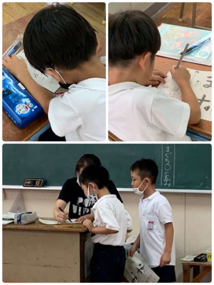 1年生の国語の時間です。かきかた練習をしています。1年生の初めに学習した「ひらがな」の復習です。特にバランスを取りにくいひらがなの書き方を、再度、練習しています。ていねいに書いて、一人一人先生に確認してもらっています。上手に書くことができた時は、うれしそうな表情をしています。
