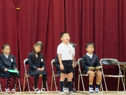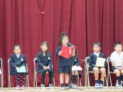 12月25日木曜日、終業式を行いました。各学級の代表の人たちが舞台にあがり、一人一人、2学期に頑張ったことを発表しました。