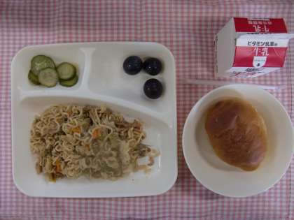 今日の給食は「黒糖ロールパン、焼きそば、きゅうりのしょうがづけ、