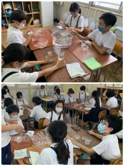 5年生の図工の授業の様子です。この授業に向けて、ご家庭で協力いただき、透明な容器を集めていただきました。ご協力、ありがとうございました。