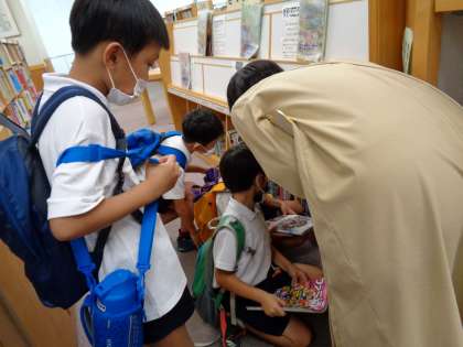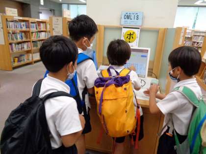 「きめつのやいばの本は、ありますか?」「おかしのつくり方を調べる本は、どこですか?」など、司書さんに聞いたり、多機能OMLIS(オムリス・・・キーボード式の利用者用検索端末)で調べたりしながら、自分の借りたい本をさがしました。
