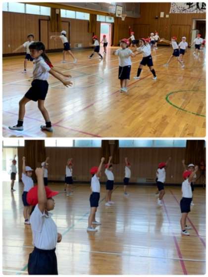 前で模範演技をしてくれている先生の動作を見ながら、曲に合わせて全体を通していました。