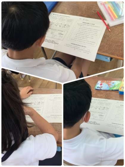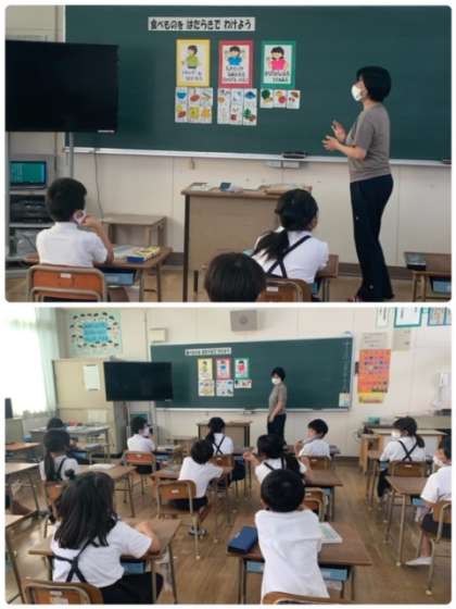 2年1組で、栄養教諭より「栄養指導」をしてもらいました。今日の学習のめあては、「食べ物を はたらきで わけよう」です。