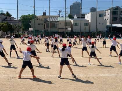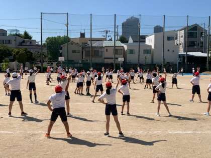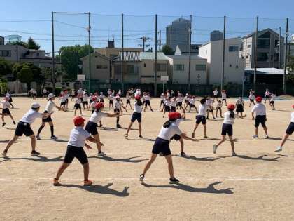 6年生の踊る姿を見本に、他学年の児童も踊っています。