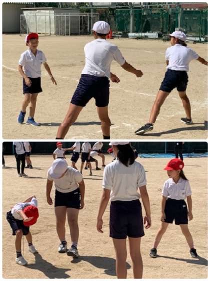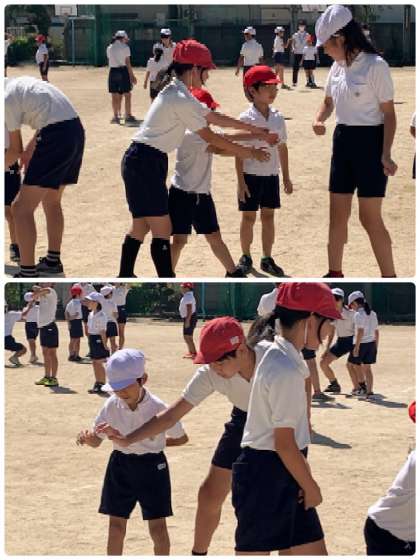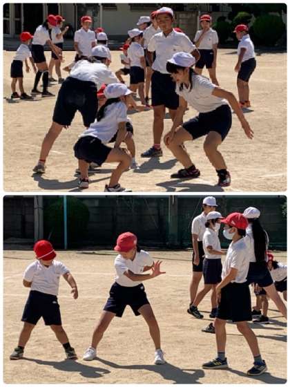 縦割り班ごとに、6年生が1年生に、4つの動きを教えてくれています。