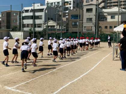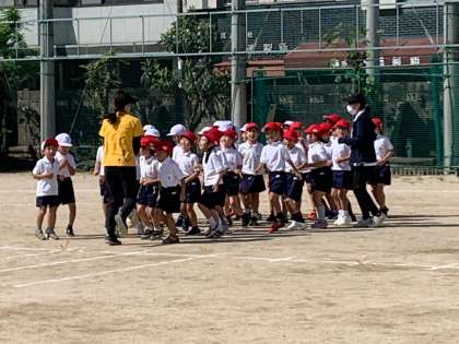 徒競走のスタート位置まで移動して、走るコースも確かめました。本番の走りを期待していますね。
