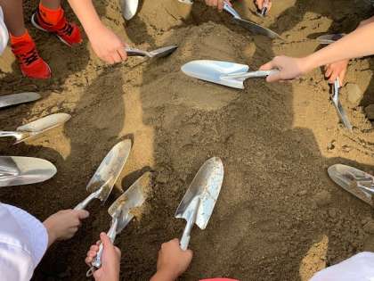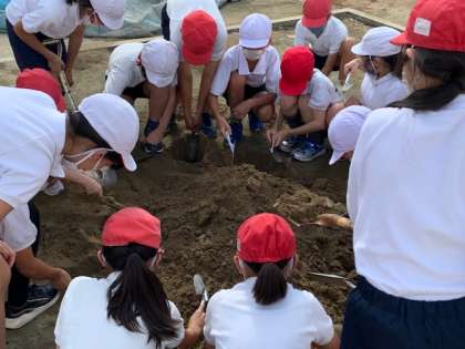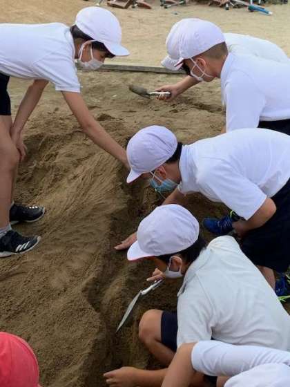 5年生の理科の授業の様子です。実験のために、みんなで山を作っています。