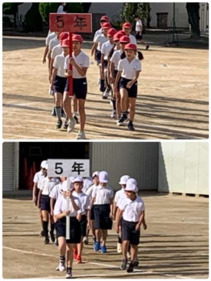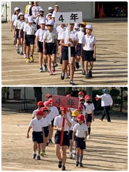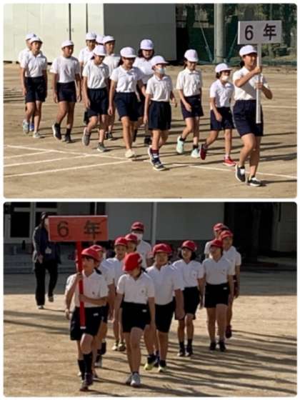 児童の入場は、6年生から順に前進し、5年生・4年生と続きます。