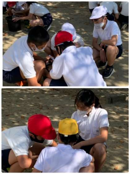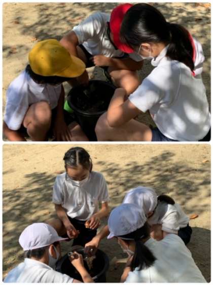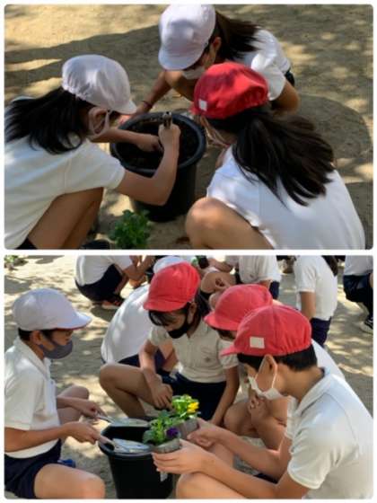 今日は、6年生がグループで相談しながら、鉢植えをしていました。