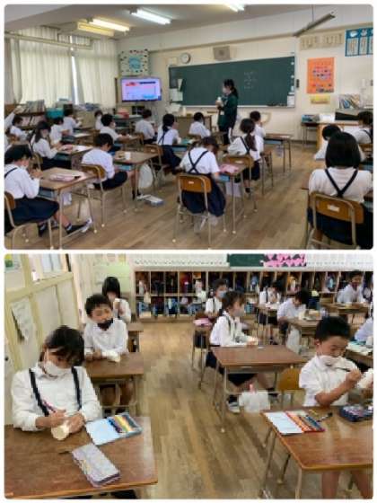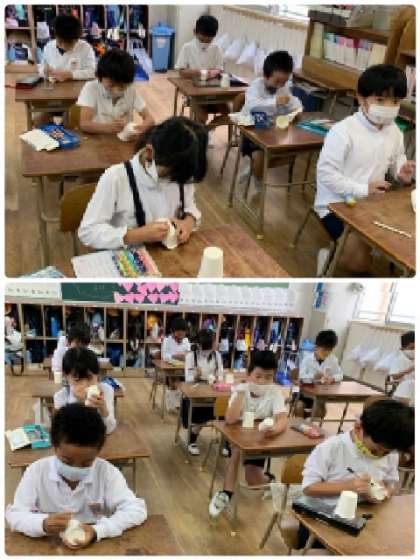 2年2組の生活の授業の様子です。身近なものを使って、楽しいおもちゃを作っています。今日は、紙コップと輪ゴムを使っています。