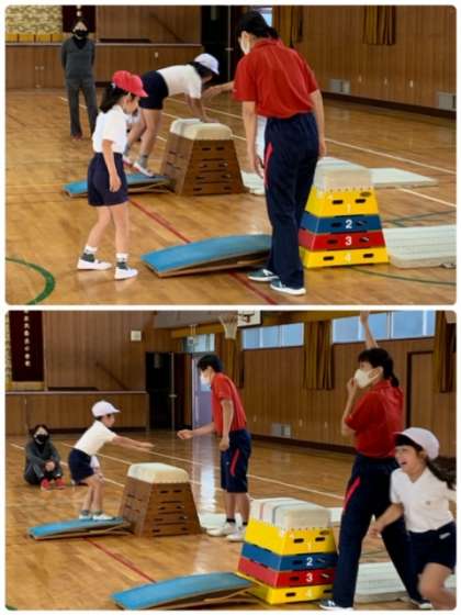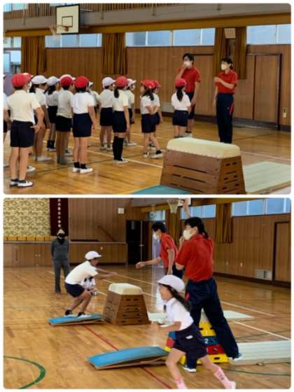 写真は、3年生へ「跳び箱運動」の指導をしてもらっている様子です。