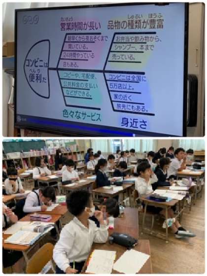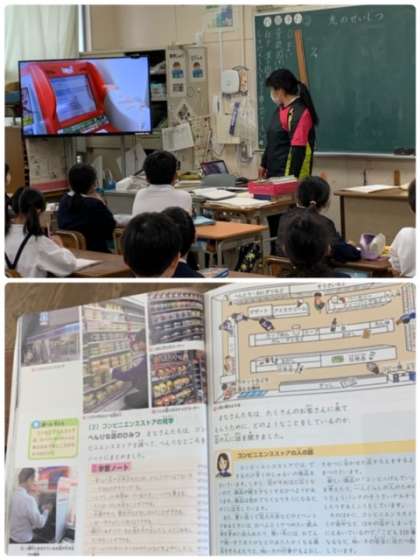 3年生の社会の授業の様子です。「べんりな店のひみつ〜コンビニエンスストアは便利だ」について学習していました。動画や教科書から、コンビニエンスストアの便利なところを見つけて、ノートにまとめています。