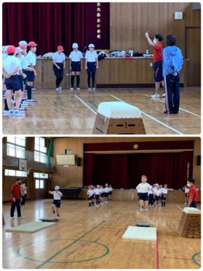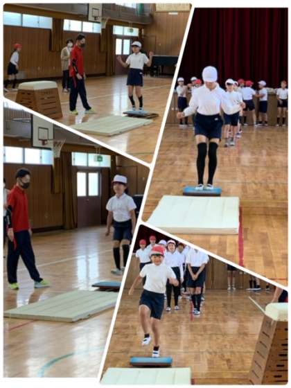 西区の体育授業インストラクター派遣事業で、5年生へ「跳び箱」の指導をしてもらいました。まずは、ロイター版の使い方、特に、踏み切る際のポイントを教えてもらっています。