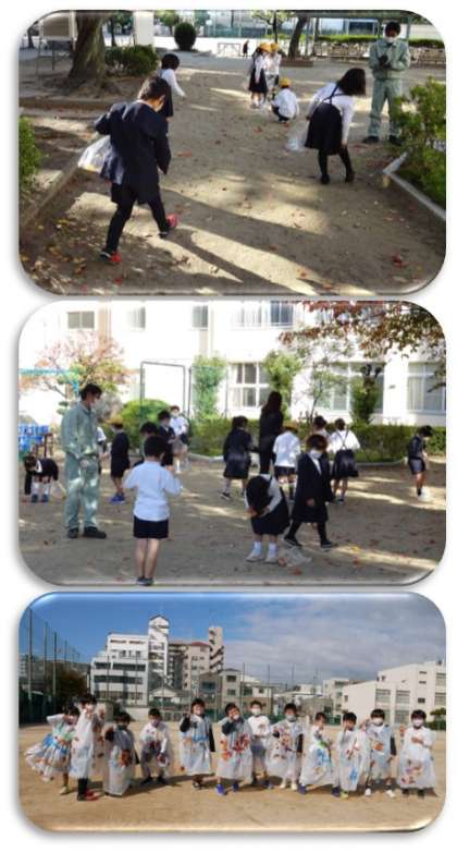 1年「落ち葉を使って」生活科 公開日 2020/11/11 更新日 2020/11/11 事務室より 今日は朝から1年生が中庭で落ち葉を集めていました。中庭には、サクラの葉が赤や黄色に色づき舞い降りています。ハナミズキも鮮やかな紅色に色づいています。 3時間目には、みんな落ち葉で飾った衣装をまとって、校内をまわってお披露目してくれていました。 いいね(0)