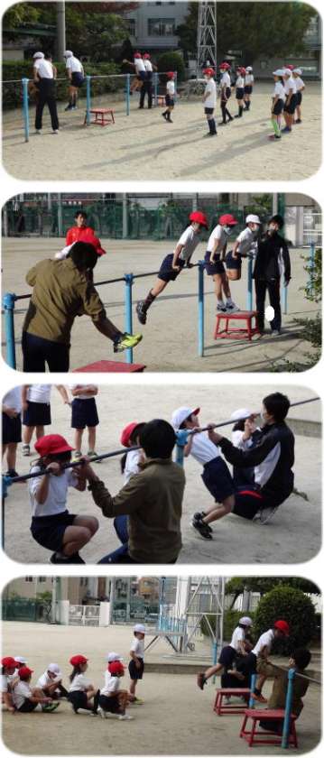 今日は4年生と1年生。どちらも鉄棒の学習です。気温が低くて冷たい風の吹く中でしたが、鉄棒の周りはちょうどお日様が照らしていました。子どもたちも楽しそうに取り組んでいました。
