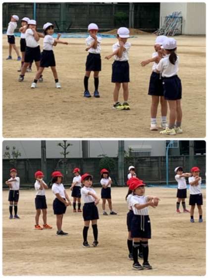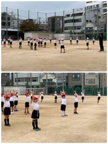 1年生の体育の授業の様子です。今日は、運動場で活動していました。最初に、ストレッチをしています。