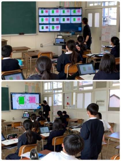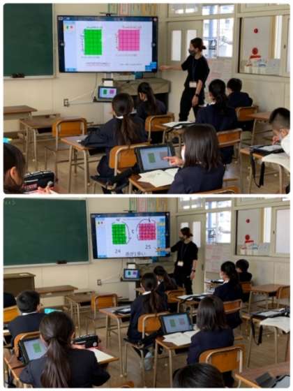 4年生は、2つの教室に分かれて、算数と理科の学習をしています。算数の授業の様子です。今日のめあては、「どれだけ広いか、くらべ方を考えよう」です。