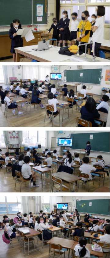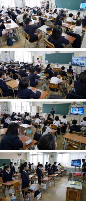 集会委員が理科室から発信します。集会委員の子どもたちがさまざまなポーズをとって、それが何か、誰かを当てるジェスチャークイズです。各教室で参加している子どもたちは、画面を見たあと、いくつかの示された選択肢のこれだと思う番号を指で出して答えていました。当たった子には拍手を送り、とても楽しそうに参加していました。