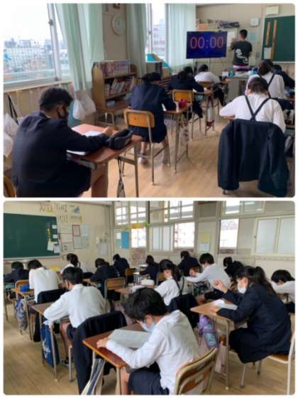 6年2組の社会の時間です。今日は、「江戸時代」についての単元テストをしています。社会のテストは自信がある様子です。結果を楽しみにしています。